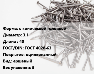 Гвоздь с конической головкой 3.1х40 ГОСТ: ГОСТ 4028-63 оцинкованный ершеный 5