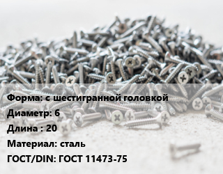 Шуруп с шестигранной головкой 6х20 сталь ГОСТ: ГОСТ 11473-75, упаковка 100 шт цена от 7.92 Р / кг, где купить, условия доставки в Минске и Минской области