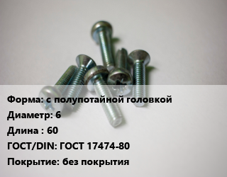 Винт с полупотайной головкой 6х60 ГОСТ 17474-80 без покрытия, 4.8, кг цена от 99.28 Р / кг, где купить, условия доставки в Минске и Минской области