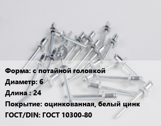 Заклепка с потайной головкой 6х24 оцинкованная, белый цинк ГОСТ: ГОСТ 10300-80