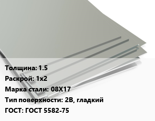 Лист нержавеющий 1.5 1х2 Сталь: 08Х17 Тип:2B, гладкий ГОСТ 5582-75