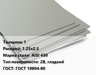 Лист нержавеющий 1 1.25х2.5 Сталь: AISI 430 Тип:2B, гладкий ГОСТ 19904-90