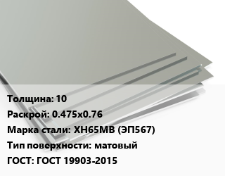 Лист нержавеющий 10 0.475х0.76 Сталь: ХН65МВ (ЭП567) Тип:матовый ГОСТ 19903-2015