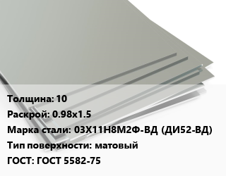 Лист нержавеющий 10 0.98х1.5 Сталь: 03Х11Н8М2Ф-ВД (ДИ52-ВД) Тип:матовый ГОСТ 5582-75