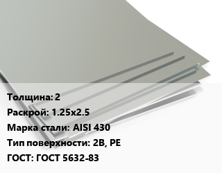 Лист нержавеющий 2 1.25х2.5 Сталь: AISI 430 Тип:2B, PE ГОСТ 5632-83