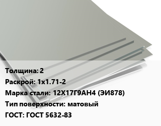 Лист нержавеющий 2 1х1.71-2 Сталь: 12Х17Г9АН4 (ЭИ878) Тип:матовый ГОСТ 5632-83