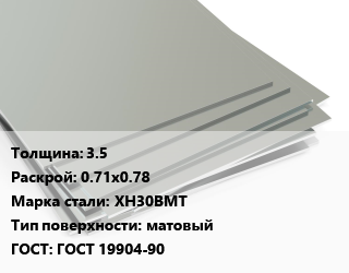 Лист нержавеющий 3.5 0.71х0.78 Сталь: ХН30ВМТ Тип:матовый ГОСТ 19904-90