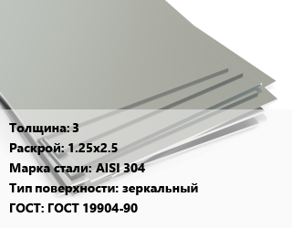 Лист нержавеющий 3 1.25х2.5 Сталь: AISI 304 Тип:зеркальный ГОСТ 19904-90