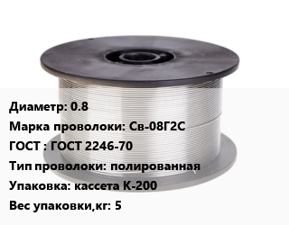 Проволока сварочная 0.8 Сталь: Св-08Г2С ГОСТ: ГОСТ 2246-70 полированная кассета К-200 5