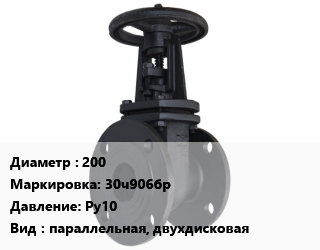 Задвижка чугунная 200 30ч906бр Ру10 параллельная, двухдисковая